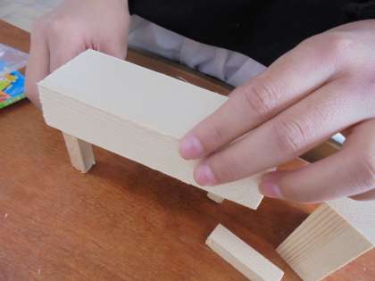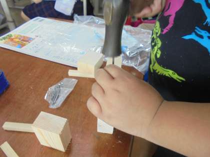 くぎを使ってできる作品を考えています。くぎを打って,木と木をつなげていました。