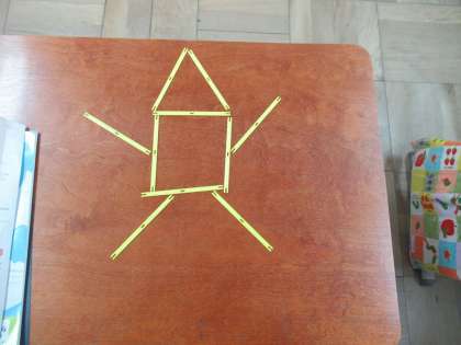 棒を使って,三角や四角など形を組み合わせていろいろな形を作りました。