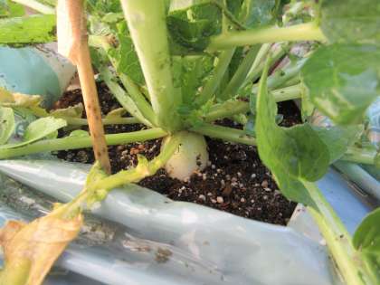 大根が大きく成長し,土から白い大根が見えるほどになってきました。まだまだ細い大根ですが,これから太く大きく成長していくことに期待しています。葉に虫がつくようになり,成長を阻害し始めているので,木酢液の虫よけ剤を使って対策もしました。
