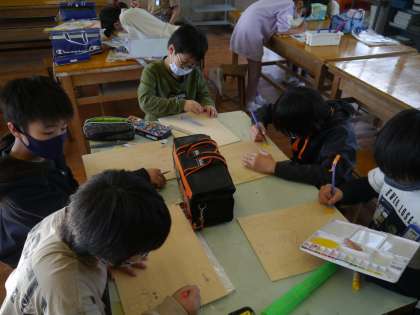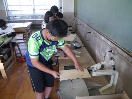 糸のこの練習しています。鳥や怪獣など曲線がたくさんある形に木材を加工しました。角度を大きく変えるために,板をゆっくり回転させる難しい作業に,あきらめず何度も挑戦していました。