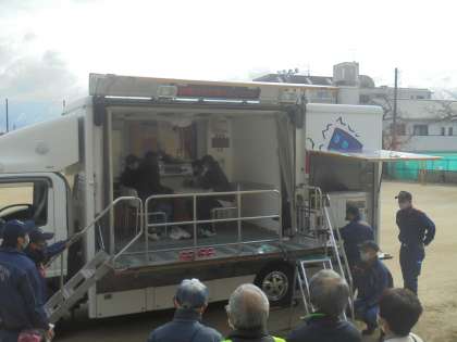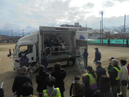 設営訓練後は,各グループで分かれての訓練が行われました。今年度は,起震車も来て,震度5弱などの地震を体験されていました。