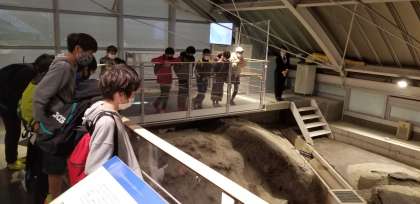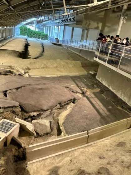 野島断層を見て,子どもたちは地震による地面のズレに驚いていました。