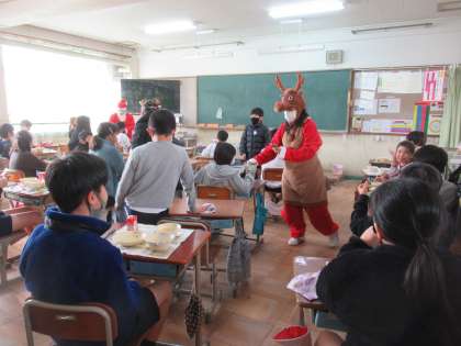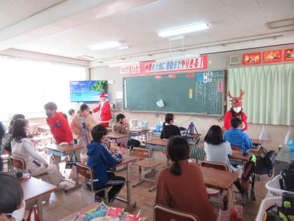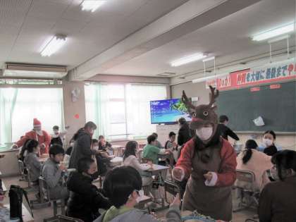 図書ボラさん作成のしおりのプレゼントに,子どもたちは喜んでくれました。校長サンタが登場したクラスは,低学年も高学年も楽しんでいました。図書ボランティアさん,おりがとうございました。
