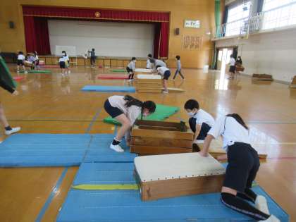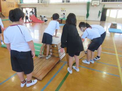 「ねらい2」に向かって,跳び箱の配置換えです。てきぱきと協力して,練習の場をつくりました。子どもたちが自主的にどんどん動いていました。
