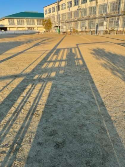 朝は,太陽が高くないので,運動場に映る影がとても長くなっていました。(左写左)