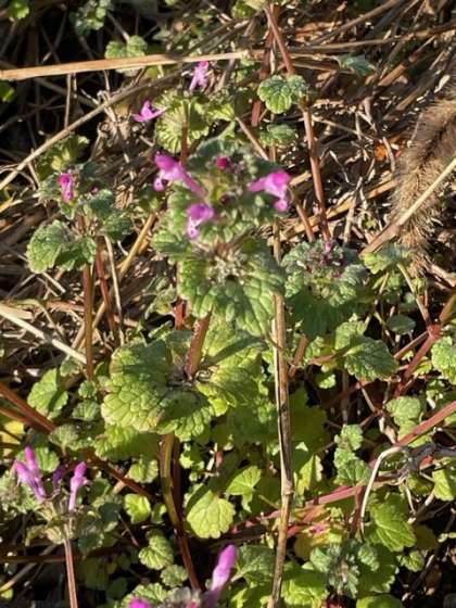 東門を出たところの畑の中に,ホトケノザの花がもう咲いていました。(写真中)春の七草と呼ばれていて,春に咲く花です。