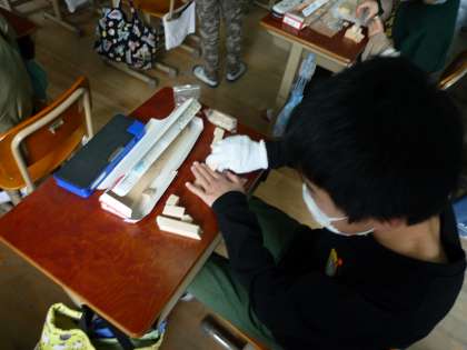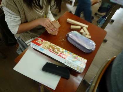 のこぎりで切った木を,いろいろな形につなげていました。