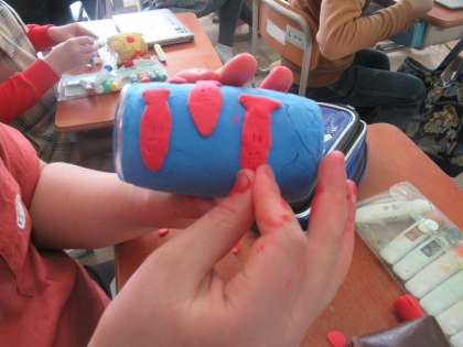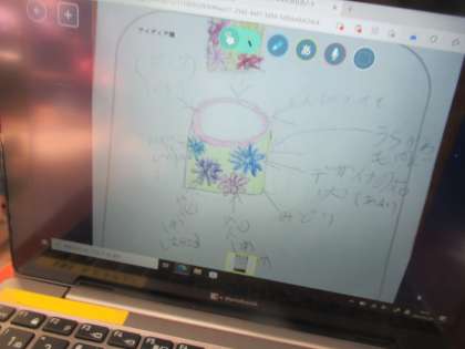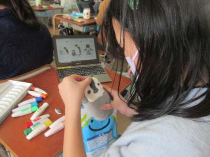 ペットボトルやびん,箱に,色をつけた紙粘土を貼り付けて,自分だけの容器をつくりました。GIGA端末を使って,ロイロノートにアイデアを描いたものを写真で写し,それを見て確かめる子どももいました。つくりながらイメージを膨らませ,集中して活動する姿が見られました。