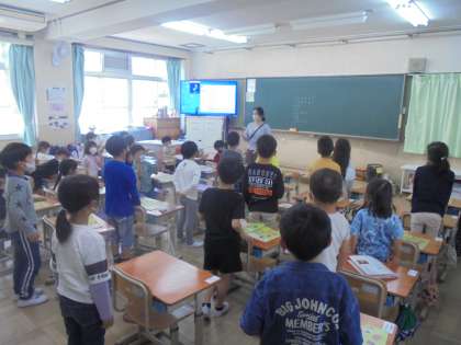 「1,2,3,4,5,6,7」をリズムに合わせて,歌いました。教室でグループを2つに分けて楽しく歌っていました。