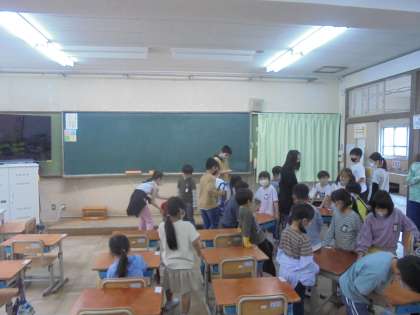 6年生が手伝いに来てくれています。1年生は,6年生の掃除する姿を見ながら,一緒に掃除を頑張っていました。