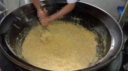 『ビビンバ』は,ごはんに肉やたまご・ナムルなどの具をまぜて食べます。給食調理員さんが大きな釜で卵を炒って,おいしい具を作ってくれました。
