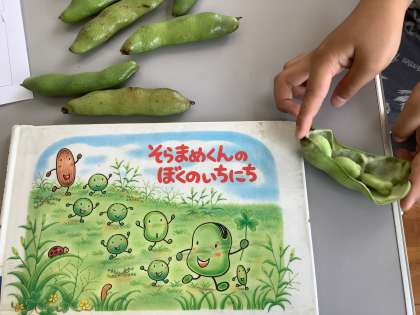 先日観察したスナップエンドウとの違いに着目しながら,今回はソラマメの観察をしました。「ソラマメのさやは,絵本のお話みたいにふわふわのベッドみたいになってる!」と子どもたちは興味津々で,目・鼻・手・心の全部をよく働かせながら観察することができました。