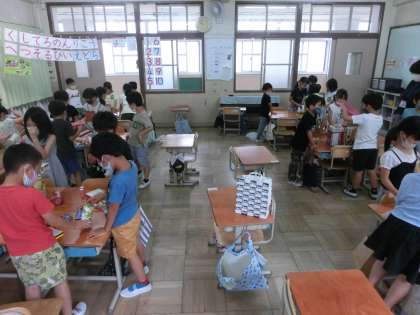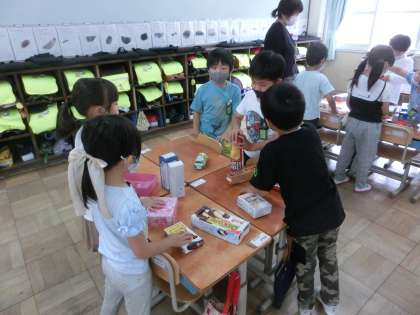 家から持ってきた箱をキリンや車・お城などの形に積みました。5人づつのグループに分かれ,協力しながら作りました。