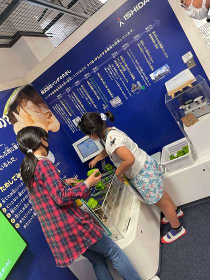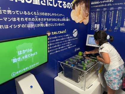 いろいろと触って,重さが同じようになるはかりの体験をしています。