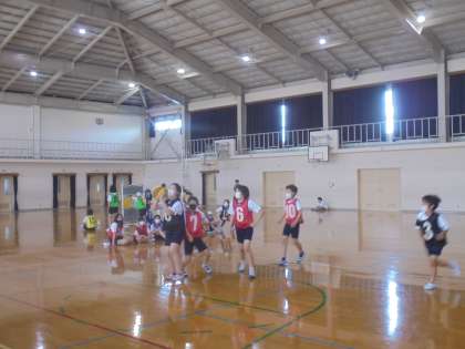 体育館でバスケットボールの学習をしています。友達に声をかけながら学習をしていました。