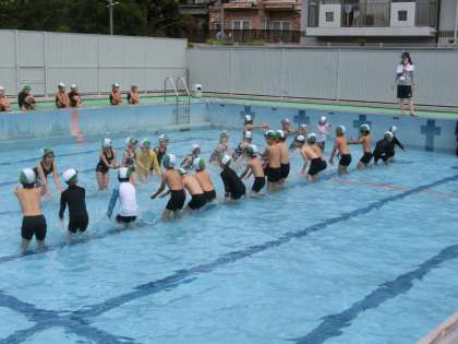 今週は水遊びがありました。今週は低水位で50センチメートルでした。初めての大きいプールに緊張していた子どもたちですが,水に入ると笑顔がこぼれていました。来週は70センチメートルになります。