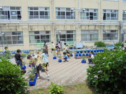 トマトの苗が大きくなってきました。支柱をたてて,トマトの苗がさらに大きくなってもいいように準備をしました。