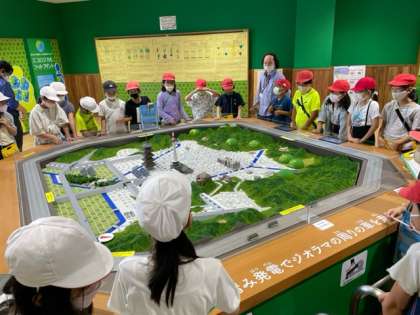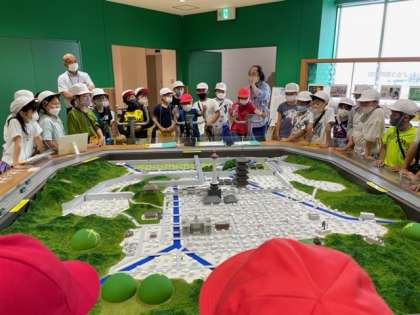さすてな京都の展示を見ながら,職員さんの説明を聞いて学習をしています。