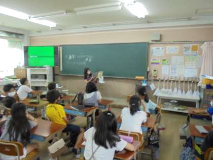 あじさい読書週間の取組で,全校で他学年の先生が読み聞かせを行いました。