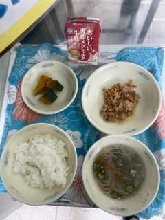 今日は和献立でした。かぼちゃはとっても柔らかく、甘かったです。あと、とりそぼろどんぶり と 七夕そうめん を子どもたちはおいしくいただいていました。今日も給食調理員さん,おいしい給食をありがとうございます!