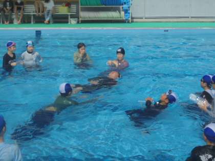 外部より講師に来ていただき,着衣水泳を行いました。服を着て泳ぐことが,どれだけ泳ぎにくく,大変なことなのかを実感することができました。また,安全な浮き方を教えていただき,みんな真剣に練習をしていました。