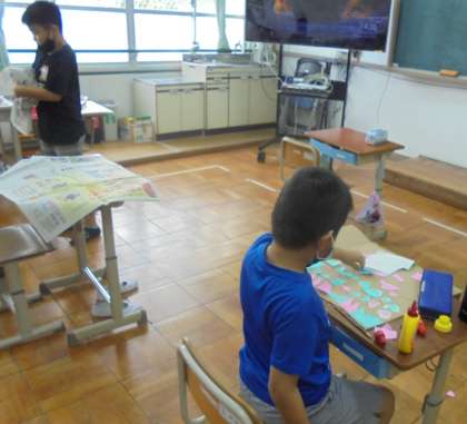紙を切ったり、ボンドで貼ったりしながら作品を作っています。