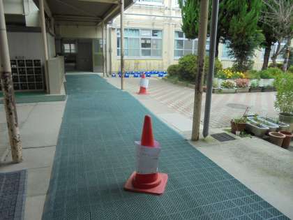学校での安全をよりよくしようと、保健委員会で活動を考えて取り組んでいます。廊下で走ってしまいそうになるところに、コーンとポスターを置いています。休み時間には、委員会の子どもたちが声をかけて頑張っています。