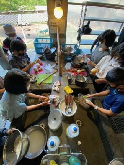 野外炊事を開始しています。食器・鍋を洗ったり、食材を切ったりしています。