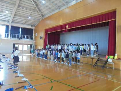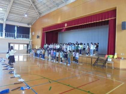 体育館での練習を始めています。学年そろって位置などを確認しました。