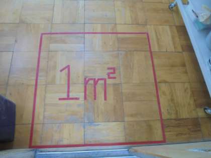教室の入口に、「1平方メートル」の大きさがわかりやすく示してあります。面積の感覚をつかんでほしいと思います。