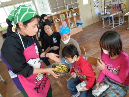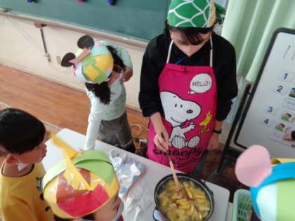 子どもたちが楽しみにしていた「おいもパーティー」を行いました。おいもをゆでている間も子どもたちは気になる様子でした。おいもが茹で上がると,「色が変わった!」「ほかほかやなぁ」と,わくわくした気持ちが伝わってきました。