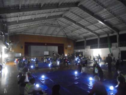 真っ暗闇の中で、ランタン等の明かりを頼りにしながらでの設営体験でした。体育館で、ブルーシートを使って、共同生活空間を作るための設営をされました。ブルーシートに寝ころび、通路に人が通るとどのような感じになるのかも体験されました。