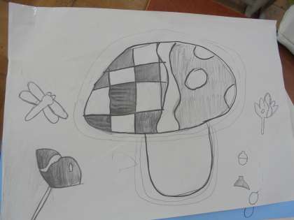 子どもたちがいろいろと想像を膨らませた下描きを終えて、彫り進めていきます。