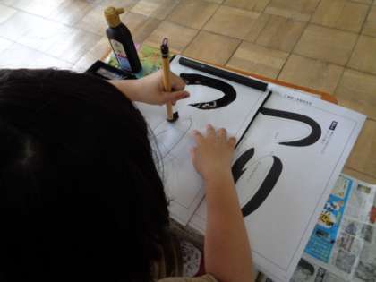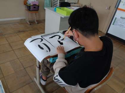 3組では習字の学習に,定期的に取り組んでいます。息を整え,じっくりお手本を見て,筆の運びもスムーズになってきています。今回は「つり」の文字。初めてのひらがなです。納得の文字を書き,笑顔がこぼれています。