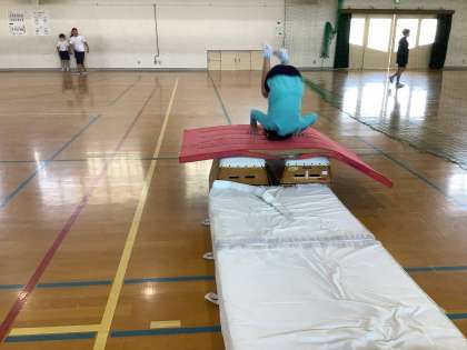 それぞれに合った跳び箱の高さで練習しています。中には,とび箱の上で前転をする技に挑戦している子もいます。準備や片付けも,みんなで協力してスムーズに行うことができました。