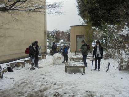 子どもたちは雪をかき集めて、大きな雪の玉を作っていました。体の半分もの大きさになっていました。
