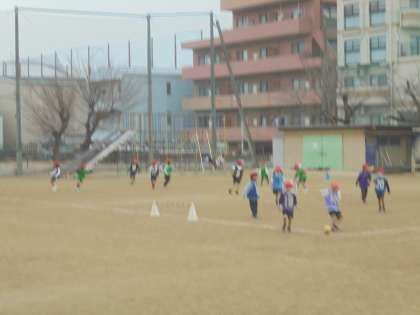 グループを作って、対戦しています。ボールをけることに慣れ親しんでいます。