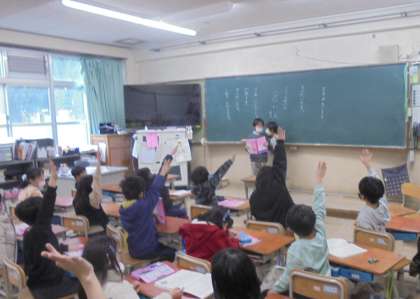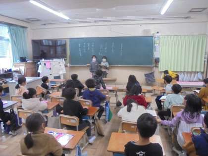 クイズの言葉をどのようにして作るのかを学習し、問題を出し合いました。子どもたちは楽しく答えていました。