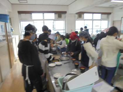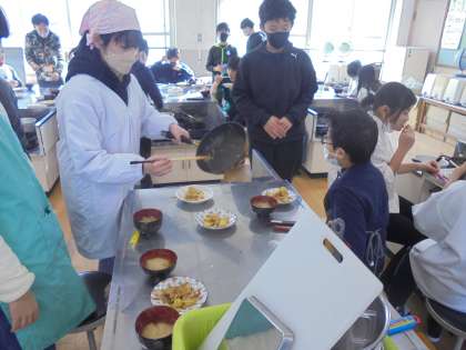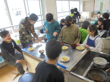お味噌汁とジャガイモ料理を作り、家庭科室からいい匂いがしていました。手際よくグループで協力して調理実習を行っていました。