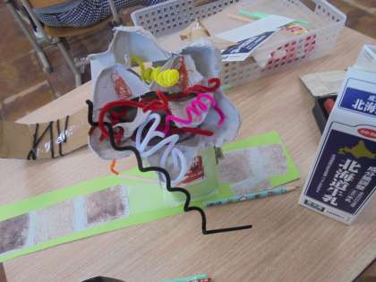 作品作りを頑張っています。ストローや牛乳バックを使って作品を作っています。
