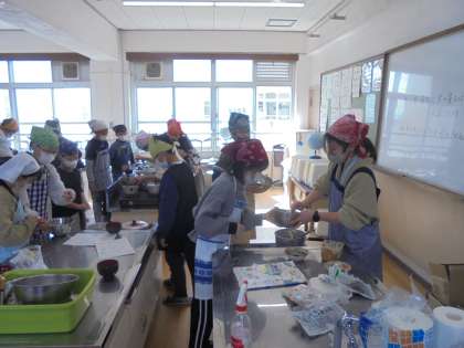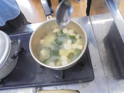 調理実習を行いました。役割分担をし、みそ汁を作りました。ていねいに味噌を溶かしてがんばっていました。