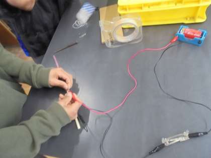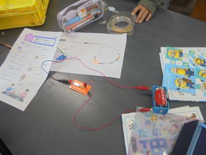 電磁石の性質を使って、魚つりゲームができる道具作りをしました。学習したことをもとに、どのように配線すればよいのかを考えました。