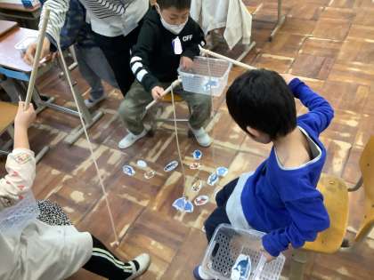 自分たちでお店屋さんを開く前に,魚つり,わなげ,ボーリング,的あての4つの活動から,好きなことに挑戦しました。
