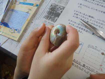 アンモナイトの化石や翼竜の化石、マンモスの歯などの化石に触れました。