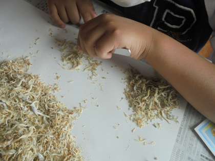 子どもたちは一生懸命探して、たこや太刀魚などいろいろな生き物を見つけていました。