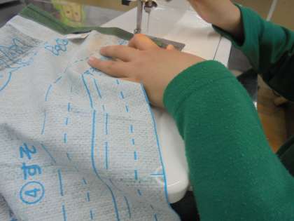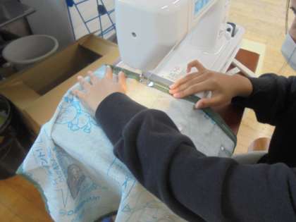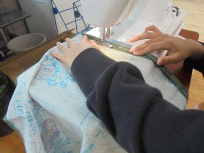 ミシンでエプロンを縫っています。丁寧にゆっくり縫い進めていました。
