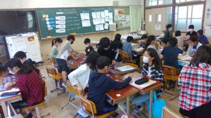 外国語科では,日本の行事を紹介する表現を学んでいます。季節の表現「In spring」と,そのあとに続く行事の表現「We have nahami」が合っていればカードをもらえる,というカードマッチングゲームをしました。班のメンバーと和気あいあいをゲームをして,楽しいひとときを過ごしました。
