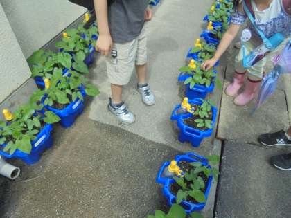 アサガオの種を植えて、あっという間に芽がたくさん出て、葉も大きくなりました。子どもたちが、「若いつるつるの葉だよ」と、芽が出たての葉を教えてくれました。