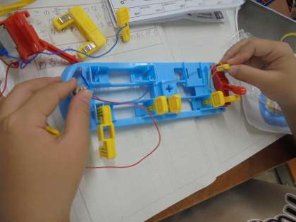 直列つなぎや並列つなぎを実際に配線し、簡易検流計で、電流の大きさを調べました。