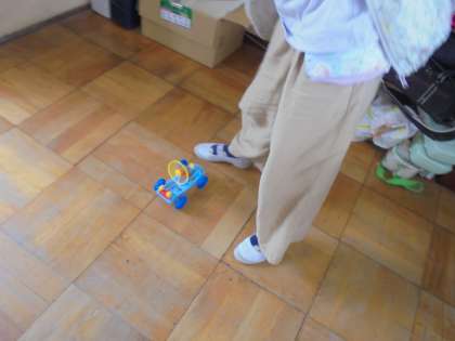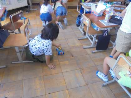 1この電池をつないだ時の力で動く車の動きについて、走らせながら確かめました。